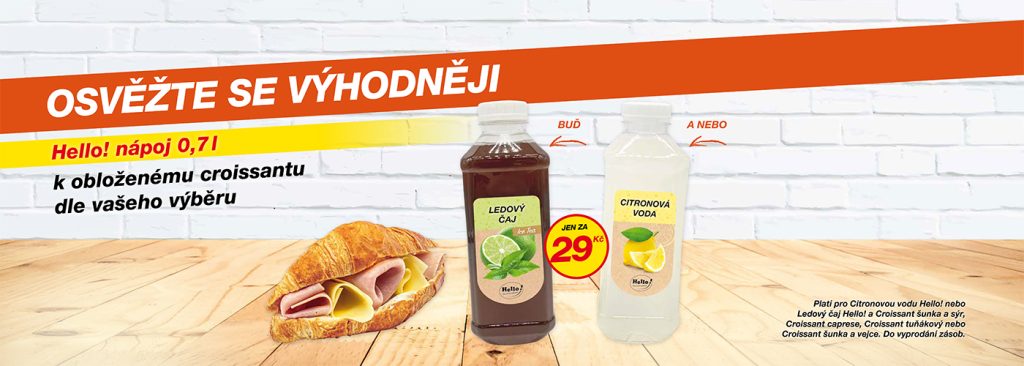 Ke každému obloženému croissantu si můžete pořídit naše osvěžující nápoje výhodněji! Objevte naši šťavnatou Citrónovou vodu nebo lahodný Ledový čaj.