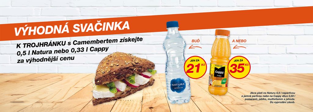 Ochutnejte bohatě plněný Trojhránek s Camembertem! Navíc k němu získáte slevu na nápoj dle vašeho výběru. Bude to ovocný džus, a nebo osvěžující voda?